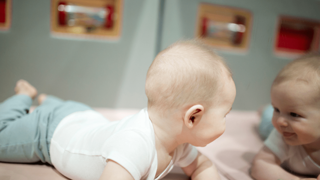 Esto permite que se descubra a sí mismo, relacione sus movimientos con su reflejo y estimule su visión. Puedes dejarlo acostado frente a este, para que gatee y se vea a sí mismo.