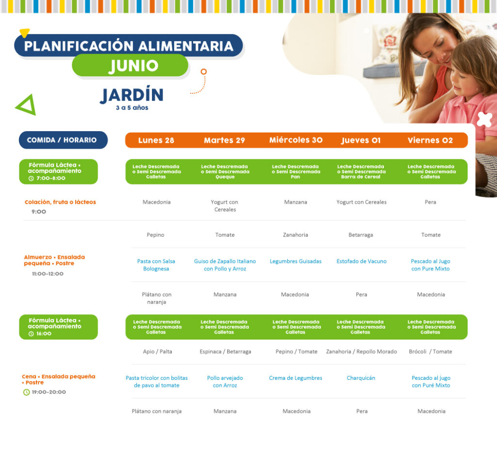 Porque estamos convencidos de que la planificación es clave para llevar una vida sana y equilibrada, queremos compartir con ustedes nuestro menú que entregamos de forma diaria en nuestros jardines de acuerdo a la edad de cada niñ@ ¡A disfrutar!